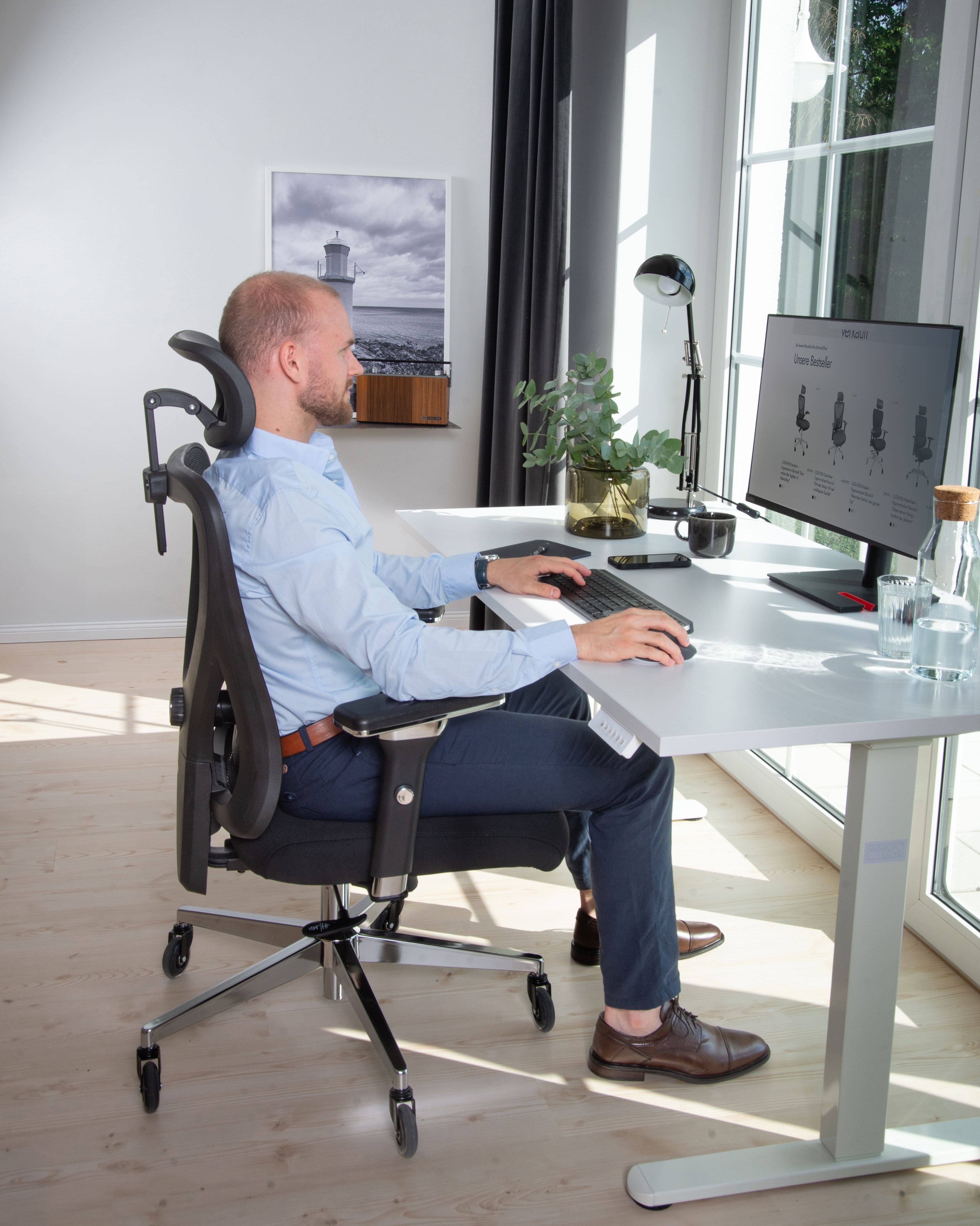 Die Bürostühle von CLOUVOU wurden von deutschen Ingenieuren entwickelt, um dich den ganzen Tag über in einer optimalen Position zu halten – für mehr Produktivität und Komfort am Arbeitsplatz.