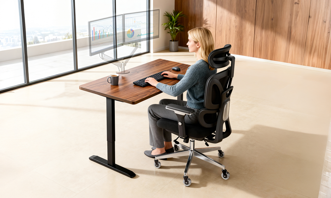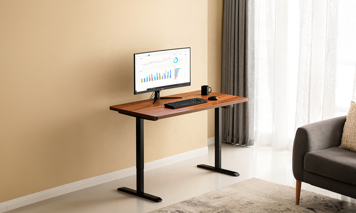 Verstärktes Gestell mit Dual-Motor-System. Trägt bis zu 120 kg ohne Kompromisse. Stabil in jeder Position, über Jahre hinweg.